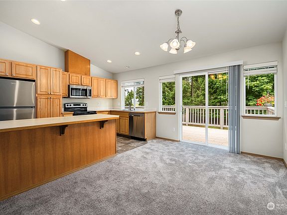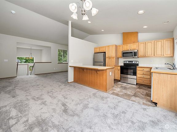 Discover your dream home in this updated split-entry gem, featuring an oversized 3-car garage & convenient RV parking. This haven boasts vaulted ceilings, creating a bright & airy ambiance throughout its 3 spacious beds + den & 3 baths. The primary suite offers a private retreat w/ an attached bath & walk-in closet. Cozy up by the fireplace in the inviting living room, which seamlessly transitions to the kitchen, complete w/ SS appliances & an eating bar. Entertain guests on the large deck or enjoy serene moments in the large, fully fenced backyard accessible from the generously-sized downstairs family room that flows to the patio. Perfectly located just minutes from Costco & Lake Tapps, this home combines comfort w/ unbeatable convenience!