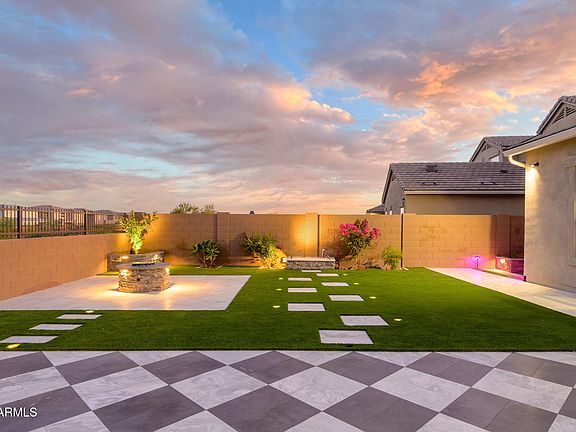 The 7,038-square-foot lot offers a private, low-maintenance backyard that feels like a personal resort, with no rear neighbors to interrupt your tranquility. Stackable sliding doors seamlessly link indoor spaces to patios, creating an open atmosphere perfect for entertaining or enjoying sunlight. Stunning mountain views create a picturesque backdrop, and the expansive space is prepped for a future pool, offering endless possibilities for customization. Gather around the heated gas fire pit and fireplace for cozy evenings or lively outdoor entertaining. A raised garden bed with a prewired fountain serves as a striking focal point, complemented by custom landscaping featuring premium turf, limestone accents, and elevated stones for a maintenance-free design. Upgraded outdoor lighting enhances ambiance and safety, while an automatic sprinkler system effortlessly maintains the raised garden beds and front yard. The large patio is perfect for al fresco dining, barbecues, or simply soaking in Arizona's iconic sunsets.