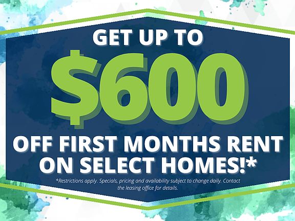 - Special offer! Get up to $600 off first months rent on select homes! *Restrictions apply. Specials, pricing and availability subject to change daily. Contact the leasing office for details. -