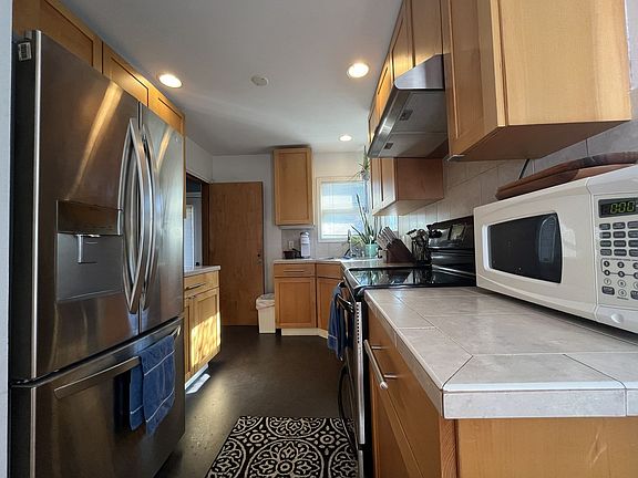 The kitchen features ample countertop space and a full suite of stainless steel appliances, including a refrigerator with French doors, electric oven with glass stovetop, dishwasher, and a double-basin sink nestled in the corner with corner windows for added brightness. There's also a charming breakfast nook between the kitchen and living areaperfect for morning coffee or casual meals.