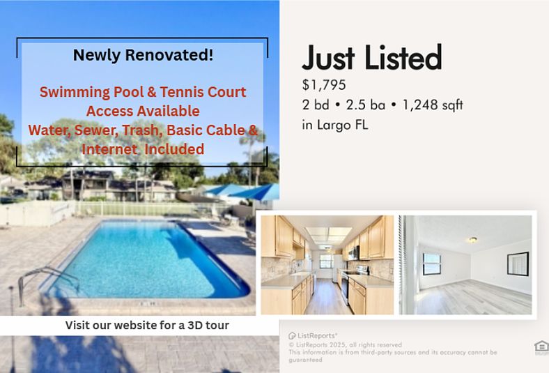 Beautiful 2 beds 2.5 baths Townhouse available for lease in Largo with 10 Stars Property Management Discover your perfect Florida lifestyle at 2131 Ridge Road South, Unit 119, Largo, FL 33778 a bright and inviting residence tucked away in a quiet, well-kept community just minutes from everything you love about the Gulf Coast! Enjoy a prime location only a few miles from Indian Rocks Beach and Belleair Beach, where you can spend your days soaking up the sun or watching breathtaking sunsets over the water. You're also close to Largo Central Park, the Highland Recreation Complex, and the Largo Cultural Center, offering year-round events, fitness, and family fun. With easy access to US-19, Downtown Clearwater, and St. Pete, plus endless options for shopping, dining, and golf nearby, this home delivers unbeatable convenience and coastal charm the perfect blend of relaxation and excitement! 3D Virtual Tour: Click Here to Explore Features: - Mix of tile and vinyl flooring for durability and easy maintenance - Sleek stainless steel appliances for everyday cooking convenience - Convenient dishwasher for hassle free cleanup after every meals - Refreshing ceiling fans for added comfort throughout the home - Window coverings for privacy and light control - Laundry room equipped with washer and dryer for ultimate convenience - Walk in closets for ample storage and organization - Water, sewer, and trash included, simplifying utility expenses - Basic cable and internet are included - Power is the tenant's responsibility, ensuring individual usage control - Access to the community heated pool and tennis court for recreation and fitness - Assigned parking for secure and designated parking spaces. Pets are allowed. No more than 2 pets per property. Weight limit of 55lbs per pet. No aggressive breeds. Applicants must complete a free pet application and have animal approved with vaccination record. The monthly pet fee will be determined by your pet screening score. Does not apply to medically/emotional support prescribed and/or service animals. Every applicant 18 years of age or older is required to complete a separate application. Each application is a $65 non refundable fee. A credit and background check will be conducted for all applicants, and management approval is required prior to signing the lease. At 10 Stars, we offer multiple services to make your stay with us easy and comfortable. We have a same-day application approval and a quick move-in for no additional cost. Our team is professionally trained and will be able to assist with any leasing, billing, or maintenance issues our tenants have. We also offer an emergency line available 24/7 for any urgent cases. Tenants have access to an online portal where they can make rent payments, communicate with our team and get updates on their payments and maintenance requests at all times.