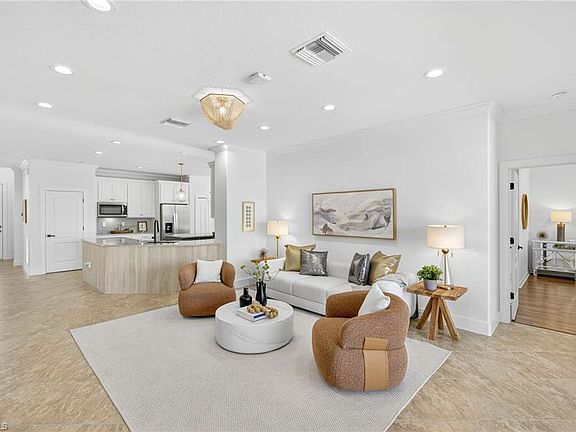 Step inside and enjoy a thoughtful layout where natural light and southern exposure lead to sweeping water views. This four-bedroom, three-bath Tivoli model with a three-car garage—built in 2019—blends open living with private retreat in the heart of The Groves At Orange Blossom Ranch. Step inside and enjoy a thoughtful layout where natural light leads to sweeping water views. The great room flows into a gourmet kitchen with quartzite countertops, stainless steel finishes, a wine fridge built into the island, and a breakfast nook. A formal dining room with crown molding and a stunning lanai set the stage for elegant evenings and peaceful mornings. Crown molding continues into the living room and owner’s suite, adding timeless detail. The primary suite itself features a spa-like bath with dual vanities, soaking tub, and separate shower, plus a custom California Closet for organization. Three additional bedrooms—each with water views—offer comfort for family and guests. Details elevate this home: tile flooring in the kitchen, dining, entry, and living areas, laminate wood in the bedrooms, and a custom built-in media wall for your TV. A water filtration system with conditioner and UV light, a whole-house generator with underground propane tank, and a newer AC and water heater (2019) ensure peace of mind. Tech-savvy touches include smart-home features with touch-sensitive light switches, a smart LED mirror, a cell phone/WiFi booster, a Ring doorbell, plus five separate exterior cameras with DVR for added security. Overhead garage storage racks provide practical convenience. Outdoors, enjoy your very own private “Spool”—a unique combination of pool and spa with a sun shelf perfect for lounging. Even the backyard is special, featuring an HOA-approved Purple Martin nest for seasonal charm. Life in The Groves At Orange Blossom Ranch is equally rewarding, with resort-style amenities: two pools, spas, tennis, basketball, sand volleyball, a fishing pier, playgrounds, splash pad, and a clubhouse for gathering. With low HOA fees, no CDD, and top-rated schools nearby, the setting is as practical as it is inspiring. This is more than a residence—it’s a rare opportunity to live with ease, elegance, and innovation, waking each day to water views and a lifestyle where luxury feels effortless.