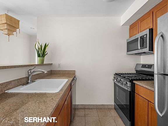 This thoughtfully laid out residence features oversized double-pane windows with both northern and southern exposures, bathing the space in natural light throughout the day. The open-concept kitchen is outfitted with brand-new stainless steel appliances, including a newly replaced stove, microwave, and dishwasher, complemented by granite countertops and maple wood cabinetry. Wide-plank hardwood floors run throughout the home, and the spacious living/dining area offers an inviting backdrop for daily living and entertaining. Both bathrooms are appointed with marble tile and quality fixtures. The primary suite includes a private en-suite bath and a separate utility room.