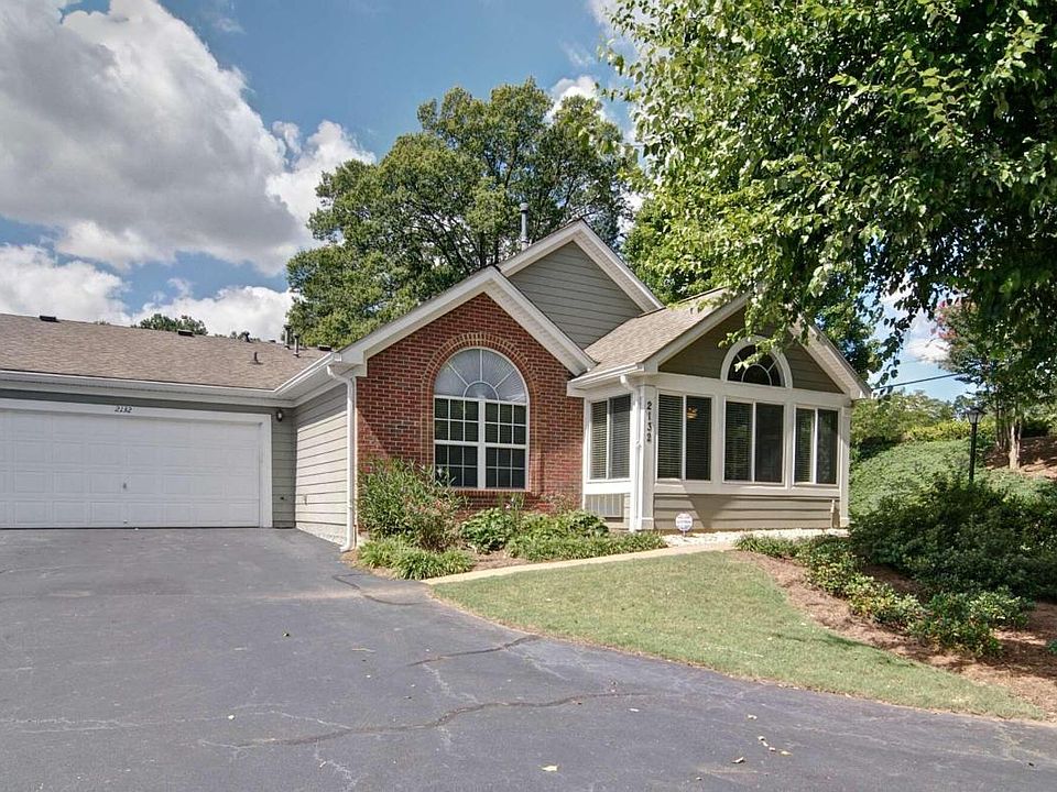 Beautiful Ranch Condo located in the Crossings of East Cobb! This fabulous one level home features an open floor plan with high ceilings, wood floors, loads of white kitchen cabinets and counter space with granite countertops and tile backsplash. Dining area has custom built-in bookcases and view to the great room with gas log fireplace and the beautiful sunroom. Two generous bedrooms each have walk-in closets and a full bath. Desirable split bedroom floorplan. Spacious sunroom with new carpet is sure to be a favorite spot. New paint and updated lighting throughout. Large two car garage and laundry room off kitchen. Great location, great community with pool and clubhouse. The perfect amount of space!! This quiet but socially active community is convenient to shopping and restaurants.