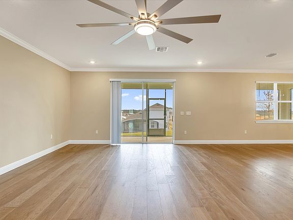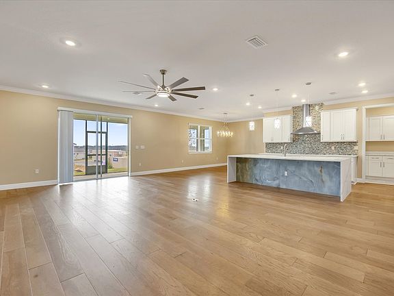 Huge lanai with enclosureCeiling fanGourmet kitchenLot upgradeCrown molding