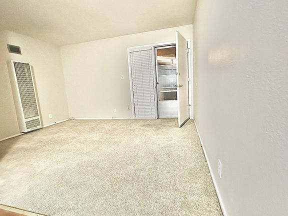 Walk in closetDining room spaceKitchen with fridgeWall heating unit