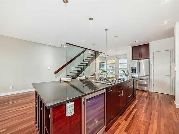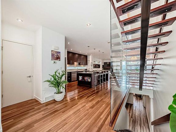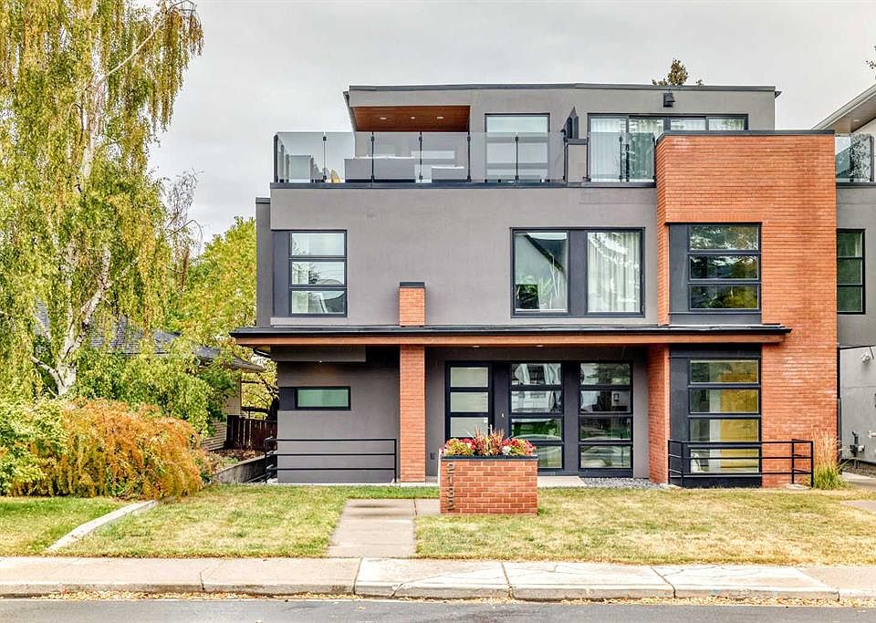 This contemporary, fully developed Inner City Home is loaded with upgrades thru-out and offers over 3200 SqFt of luxury living space complimented with a quiet location and city and mountain views from the Rooftop Patios. With 9 Foot Ceilings on the Main, central A/C and radiant in-floor heating in the Lower Level and all Bathrooms, the open concept floor plan starts with the bright Entry leading to the fully equipped gourmet Kitchen ideal for entertaining, complete with a 10 ft island with built-in wine rack, granite countertops, high-end stainless steel appliances including the gas down-draft cook top and built-in wall ovens, wine fridge and walk in pantry. The Dining area sits in front of a large floor to ceiling window, the Living Room features accent windows and a cozy gas fireplace with access to the backyard and there is the 2pce Guest Bath. The open riser staircase with glass panel wall leads up to the 2nd Level where you’ll find the massive Primary Bedroom offering a 5Pce Ensuite with walk-in shower and Air-Jet corner soaker tub plus, the 15’ walk-in closet with custom California Closet wood built-ins. There is also the 2nd Bedroom with it’s own 4Pce Ensuite, the Den/Flex area and Laundry Room. The Top Level has a 3rd Bedroom complete with a 3Pce Ensuite that can also be used as a Home Gym, Office or a Bonus Room with access to both Rooftop Patios which features stamped concrete with smoked glass panel rails (rails can be pushed out to make a full wrap around patio). The Lower Level is fully developed with a large Media/Family Room, the 4th Bedroom, another Full Bath and a Storage Room. Outside, you’ll find your private backyard oasis ideal for entertaining and the fully finished double detached Garage that’s roughed in for a heater.
