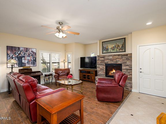 This beautiful, meticulously maintained community is located in the heart of the Desert Ridge master planned community, surrounded by lush desert landscape, adjacent to Wildfire golf course and a short walk to City North and Desert Ridge Marketplace. This perfectly placed, interior location, ground floor (no stairs) condo features tile floors throughout, 2 bedrooms plus a flex room with closet that could easily be a third bedroom or den, open floor plan perfect for entertaining, spacious kitchen with ample storage, counter space and large breakfast bar plus a walk-in storage pantry. Separate dining area easily accommodates large table and opens to a north facing, huge patio (approx. 10' x 14'). Cozy, stack stone, gas fireplace in great room, spacious primary suite with an en suite bath, dual sinks, private water closet, oversized soaking tub and large walk-in closet. 2 car garage. Furniture available. Community amenities include three sparkling, heated, swimming pools and spas complete with restrooms, barbeques and fitness centers. Two pools are just steps from condo. Additional features include: recessed lighting throughout, raised panel doors, soft water loop, gas available to range and dryer, transferable home warranty. Easy, immediate access to all the shopping, restaurants and entertainment at City North and Desert Ridge, Loop 101 Freeway via 56th St. and 5 minutes to the Mayo Clinic. Rentals 30 day minimum. Renters must register with management. Pet policy: maximum two pets less than 30lbs each.