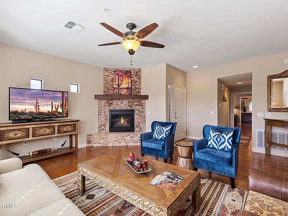 Turn key- ready for quick move-in! Resort-like living at its finest in desirable Desert Ridge with easy access to freeways, dining, shopping, golf and more. Gated community with 3 pools/spas, fitness and BBQ centers + low HOA fees. This pristine 2BR, 2BA great room home has been occupied less than 2 months a year. It has never had pets, smokers, kids nor been used as a rental. Pride of ownership shows. Fully furnished with high end furniture plus custom one of a kind pieces. One of the few corner end units with guest parking on both sides. Popular open floor plan with stacked stone gas fireplace, wood flooring and a private balcony perfect for enjoying the spectacular sunsets. New A/C compressor July 2024. Just bring your suitcase- terrific lock n' leave or full time home. A must see!