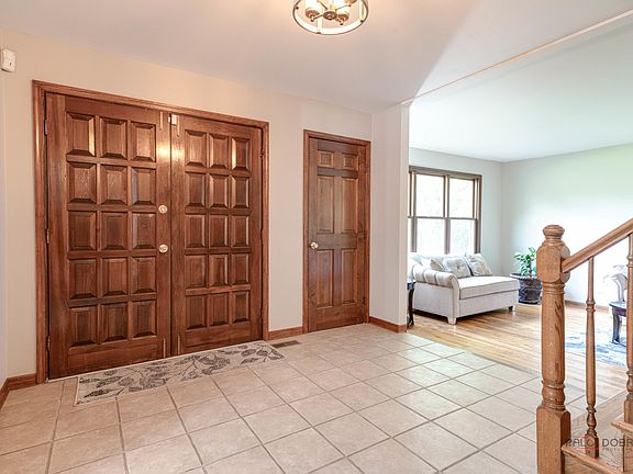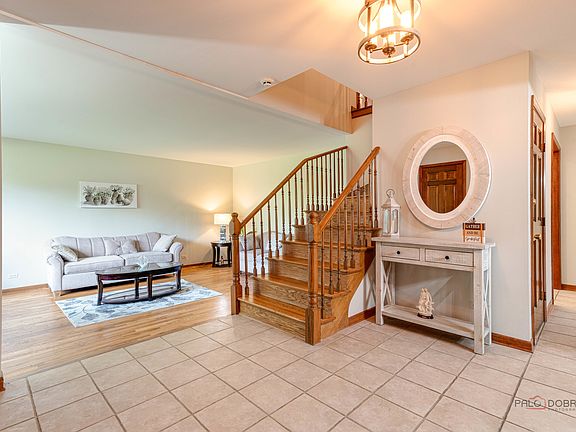 Welcome to this beautiful two-story home nestled on a quiet cul-de-sac in Kildeer, offering 4 bedrooms, 3.1 bathrooms, a full finished basement, and a 2.5-car garage, all set on an almost 1-acre wooded lot. Hardwood floors and abundant natural light fill the home, creating a warm and inviting atmosphere throughout. Step through the front double doors and be greeted by the spacious living room with a large picture window, flowing into a separate dining room perfect for hosting gatherings. The kitchen boasts wood cabinetry, granite countertops, stainless steel appliances including built-in double ovens, and a sunny eating area framed by a huge picture window. Just off the kitchen, the family room features a charming brick fireplace and sliding doors leading to the backyard patio, while the large first-floor laundry room offers added convenience with direct access to the yard. Upstairs, the primary suite includes ample closet space and a spa-like en-suite with a double vanity and glass walk-in shower. Three additional generously sized bedrooms and a full hall bath complete the second floor. The finished basement provides even more living space with a recreation room, full bathroom, and plenty of storage. Outdoor living is a dream here with a new patio, built-in firepit, and expansive grounds perfect for summer barbecues. A custom-built shed adds even more appeal, featuring 12-foot ceilings, a ceiling fan, a wood-burning stove, a cooktop, and electrical outlets-an ideal workshop, relaxation space, or storage large enough for a boat. Recent updates include a new roof (2024), shed, and patio. Perfectly located near shopping, dining, schools, parks, and forest preserves, this home offers the best of privacy, comfort, and convenience. A rare Kildeer gem you won't want to miss!