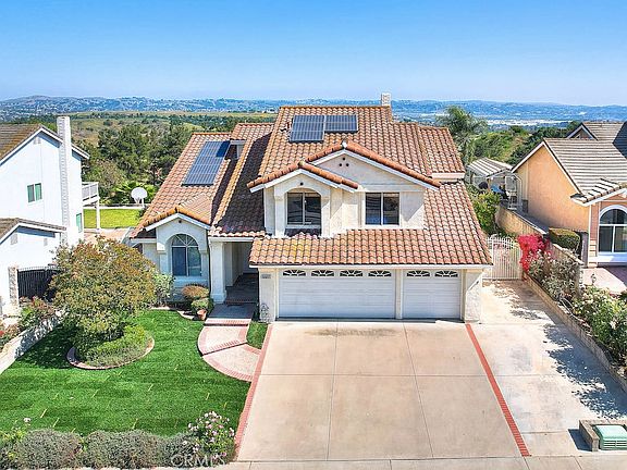 Amazing city lights view and mountain view situated on top of the hill quiet area in the city of walnut with award winning walnut school district . This two story home features new exterior paint, new stainless steel stove, new dishwasher, and new sink faucets in all bathroom! 4 bedrooms plus 1 office with closet, can use to 5th bedroom. 3.5 bathrooms including two suites. Double door leads to a grand living room and opens to the formal dining room with vaulted ceiling providing natural light. Family room has cozy fireplace, and recessed lightings. Gourmet kitchen features built-in appliances, Walk in pantry and breakfast nook, one office has closet and 1/2 bathroom on the main floor. Upstairs you will find the spacious primary suite with a large balcony enjoying the city lights view and walk-in closet , the primary bathroom features dual sink vanity, bathtub and separate shower. Lovely second primary suite has other bathroom. Other two bedroom, one bathroom located on the second floor, private backyard features sparkling swimming pool, spa, perfect for entertaining. Additional features central air conditioner and heating; Two years new water heater, Tile roof, enclosed patio, 3 attached garages with built-in cabinet, close to Mt.San Antonia College & Cal Poly University. Buyer have to assume the solar system lease.