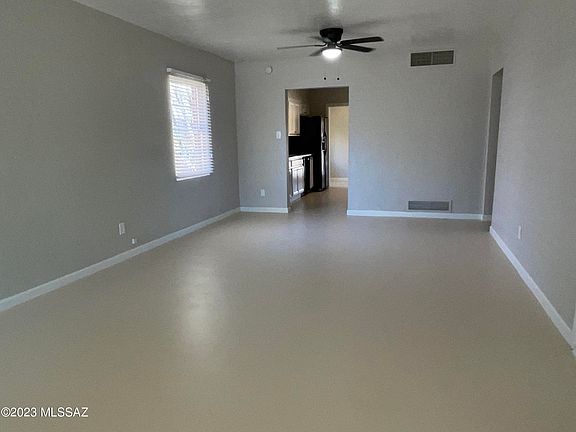 Well appointed split bedroom floor plan with three bedrooms and two baths. Just a few minutes walk from Banner University Medical Center, The University of Arizona, public transportation and other everyday needs. Living room with dining area and ceiling fan. Kitchen with refrigerator, gas range, microwave, dishwasher and disposal. An extra room/hallway with laundry closet (stacked washer/dryer included) space for home office. The primary bedroom features French doors to the covered rear patio. Guest bath has a bath/shower and large vanity. Concrete floors throughout. Two car carport in back accessible from the alley with a Liftmaster electric gate and space for additional parking. Carport also has two storage areas. Rear yard has large trees and a Ramada.