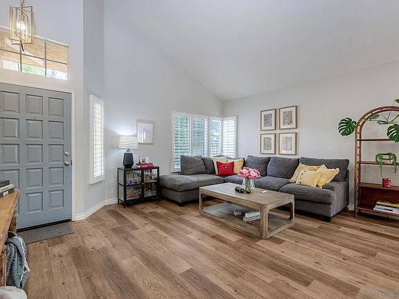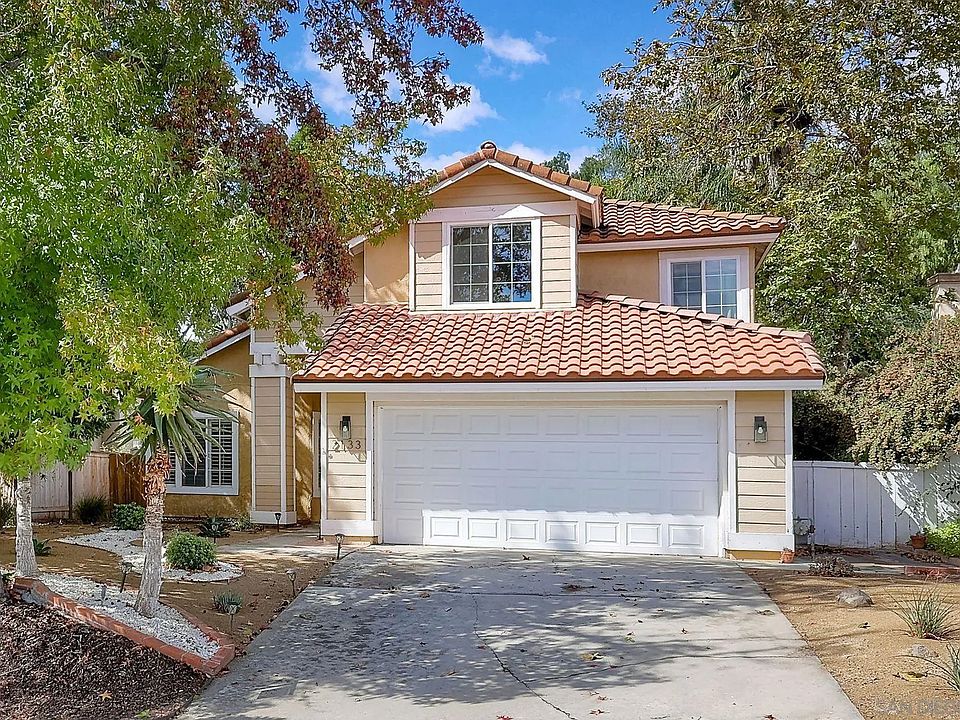 Near Lake Hodges this 4 bed/3 bath Summercreek home offers 2,324 square feet of well designed living space. As you enter, you’ll be impressed by the open, airy living/dining room with vaulted ceilings, plantation shutters, and dramatic staircase with a skylight above that provides an abundance of natural light. The kitchen boasts high ceilings with windows above the cabinets that brighten the space. A deep single basin sink overlooks the peaceful backyard, while the adjacent breakfast nook, framed by bay windows, offers a lovely spot to enjoy your morning coffee. The spacious family room, complete with a cozy fireplace, is perfect for gatherings. A sliding door to the backyard ensures this space is filled with light, making it an ideal spot for family gatherings or quiet evenings at home. Conveniently located on the main floor is 1 bedroom and a full bath, providing versatile options for a guest room, office, or multi-generational living space. Upstairs, the primary suite features vaulted ceilings and multiple windows. The ensuite bathroom includes a double sink vanity, soaking tub, and separate shower. Two additional bedrooms with ceiling fans and a full bathroom with a tub/shower combo complete the upper level. Additional highlights of this home include a 2-car garage, newer AC and furnace, a newer roof, updated windows, and an upgraded electrical panel. With its flexible floor plan, ample natural light, and prime location near Lake Hodges trails and shopping, this home is a true gem. Don’t miss your chance to make it yours!