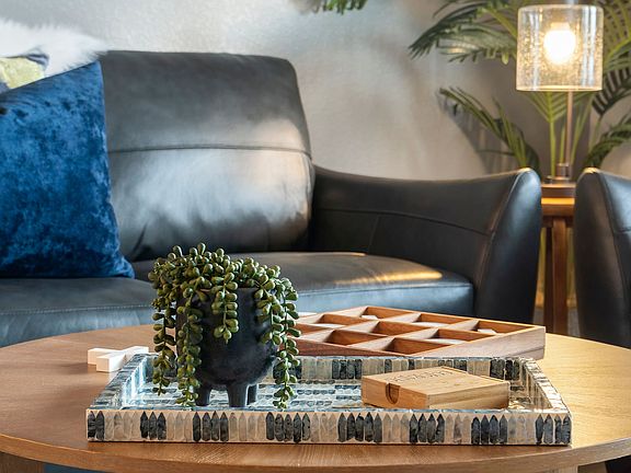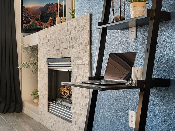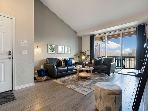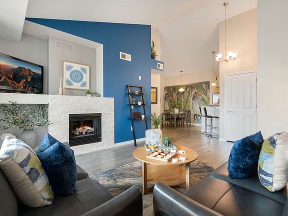 Tropical-inspired retreat! This stylish escape features vibrant greenery, a bold blue accent wall, and tropical leaf wallpaper for a fresh, vacation-like feel. Vaulted ceilings enhance the airy space, while a cozy fireplace invites relaxation. The spacious primary bedroom boasts a king bed, oval soaking tub, and blackout curtains. In summer, unwind by the outdoor pool and soak up the Colorado sunshine.