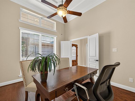Cast stone fireplaceExtra parkingVaulted high ceilingsDining tray ceilingQuiet cul-de-sac corner lotMaster coffer ceilingBronze iron rails