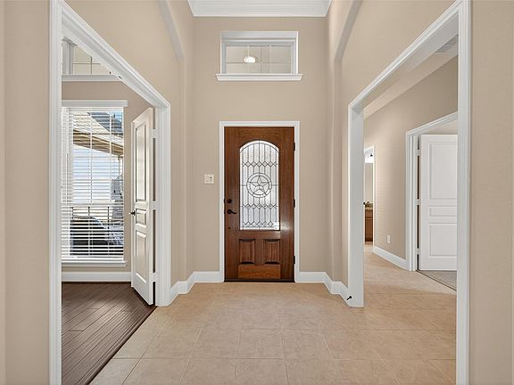 Welcome to this outstanding home in Long Meadow Farms showcasing a perfect balance of elegance & functionality. Iron Gate opens to a private courtyard, Grand Entry features extended tile, & vaulted high ceilings creating the WOW factor.Custom molding, paint, bronze iron rails, master coffer ceiling, dining tray ceiling, hardwoods, drapes, cast stone fireplace, breakfast desk extension, art niches, tile inlay design in kitchen & master shower. Water softener, unbelievable huge utility with cabinets/counter space! Extended covered patio with speakers. Master offers a sitting area and Huge Master Closet & walk-in shower! Garage has a 1/2 car extension with natural light window, Workbench/storage closet, durable & easy to clean high quality Epoxy flooring. Home shows like a model on quiet cul-de-sac corner lot-extra parking makes this home perfect for entertaining.Take advantage of neighborhood amenities pools, fitness center, tennis&pickleball courts & Trails. Quick Move-In Possible~