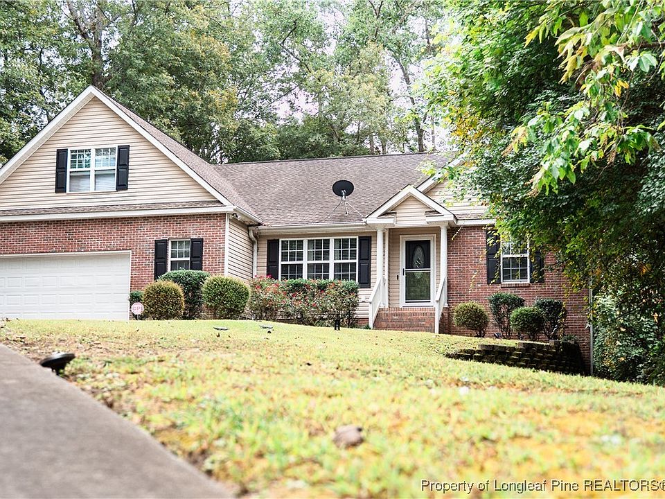 This Brick and Vinyl home in a Cul-de-sac host 4 Bedrooms / 3 Baths. Home has an open floor plan with a sunroom that brings the outside in. Vaulted Ceilings and Gas Fireplace opens up to Large Living Area. Kitchen host Natural Stone Countertops and Stainless Appliances. Laundry and Mud room with sink are right next to Garage entry and kitchen. Garage has extra storage space. Primary Suite is on the Main floor with a Jetted tub, Double Vanity, Seperate Shower and of course a Walk in closet. A 2nd Bedroom and another Bonus Room or Office are also on the Main Floor. Upstairs has 2 Bedrooms /1 Bath and still another Bonus Room. A Generac with a rented propane tank give you peace of mind in case of power outages. Trees and shrubbery give you privacy in the back yard with a deck perfect for grilling. So convenient to Hwy 87. Come and see today. NO SHOWINGS until AFTER OCT. 31/25 Restrictive Covenants and HOA info can be found on Google Search under Carolina Trace Woodfield HOA Association.