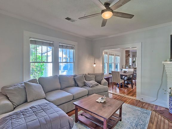 Inside, you'll find a spacious living area with a decorative fireplace, hardwood floors throughout, and a formal dining roomperfect for group meals or study sessions. The renovated kitchen features stainless steel appliances, a gas stove, and butcher block countertops. Busy mornings are easy with a dual bathroom vanity, and ceiling fans in every room keep things comfortable year-round. The laundry room with extra shelving makes staying organized simple.