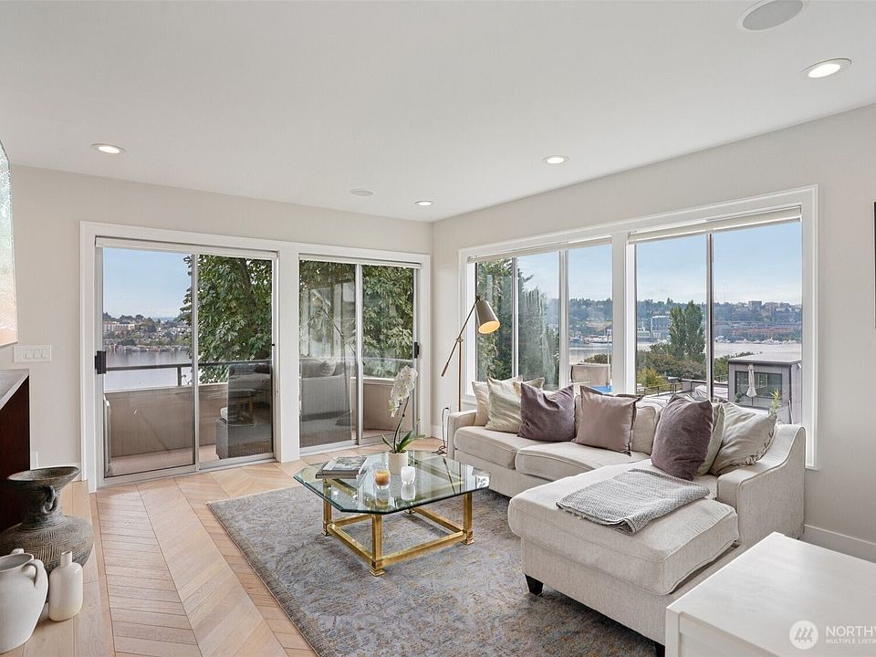 Fully Remodeled Top-Floor Condo with Panoramic Views. Sophisticated Outlook Building home with sweeping views of Lake Union, Gas Works & Downtown. Fully remodeled to the studs in 2019, this East Queen Anne condo blends modern luxury with timeless details. Features include a sunken living room with wood-burning brick fireplace, skylights, Black Forest hardwoods & custom built-ins. Gourmet kitchen with quartz counters & premium appliances, spa-like baths with radiant floors & Ann Sacks tile. Added comforts: ductless mini-splits, built-in stereo, private balcony, parking & storage. HOA covers most utilities. Walk to SLU, Queen Anne & Downtown for dining, trails & transit. No rental cap; pet-friendly (cats & dogs up to 30 lbs).