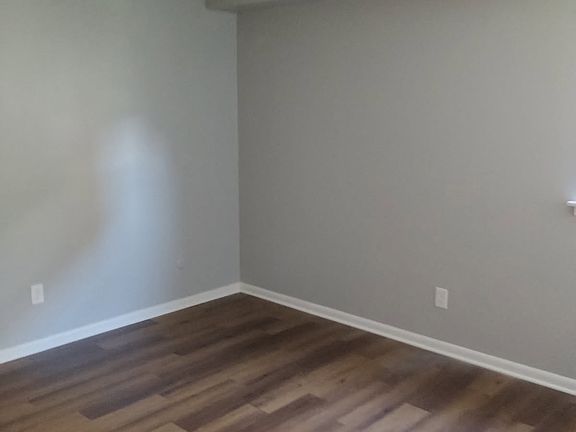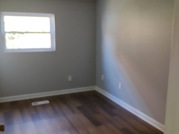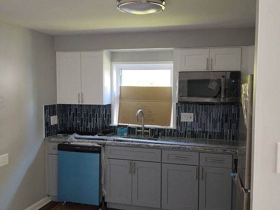 This move-in-ready 2 bedroom 1 bathroom home features a modern kitchen with granite countertops, blue glass-tile backsplash, and new stainless appliances. The bath showcases marble-look hex floors, a soaking tub, and a navy vanity with marble top. Fresh paint, sleek lighting, and warm wood-tone floors run throughout. Stylish and convenient, it offers contemporary comfort in a quiet, city-close location.