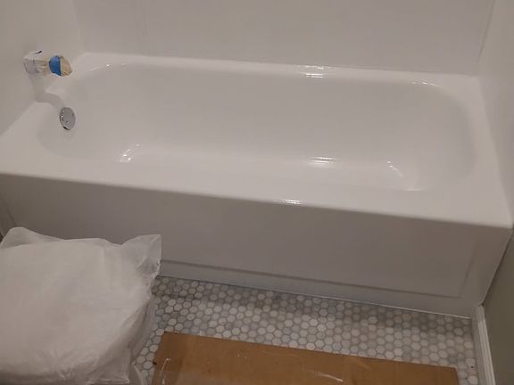 Sleek lightingFresh paintSoaking tubBlue glass-tile backsplashMarble-look hex floorsWarm wood-tone floorsNew stainless appliances