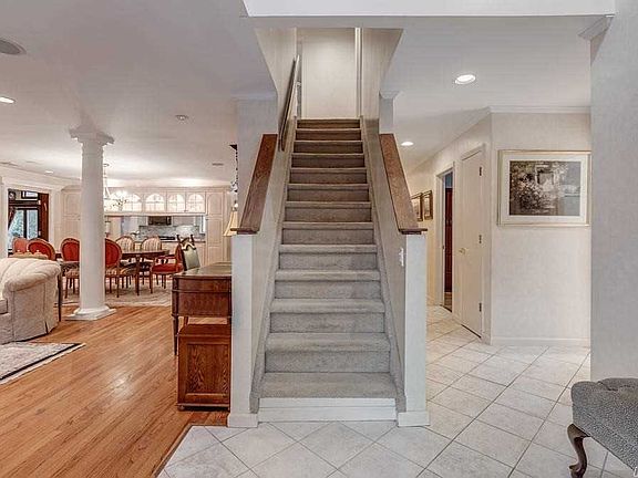 This home is located in the very desirable tree lined section of Merrick Woods. Spacious & unique 3500 sqft home offers comfort, beauty and flexibility. Boasting main floor master bedroom & 5 additional bedrooms,3 full bathrms & an open floor plan from living room with wood burning fireplace extended dining room & custom kitchen extension with cathedral ceiling & skylights. Beautiful & extensive custom cabinetry & granite countertops throughout both the kitchen & magnificent den/library featuring a dramatic vaulted ceiling, rolling ladder over custom shelving & access into a lofted game area & 2 of the 3 upper-level bedrooms. Multiple private offices for either work or school.The large renovated basement is finished with luxury vinyl plank flooring,hi hats & large closets perfect for a playroom/gym,separate entrance to a professional office suite w/waiting area. Prof landscaped with underground sprinklers & private fenced in yard makes this an easy & beautiful home to live in and love.