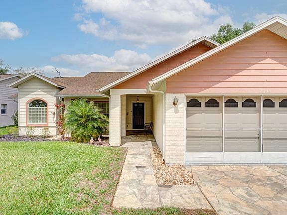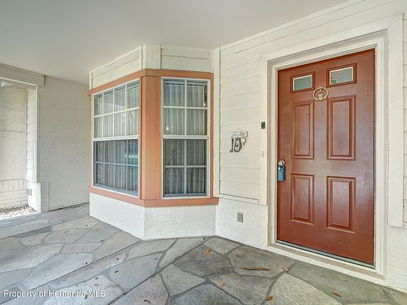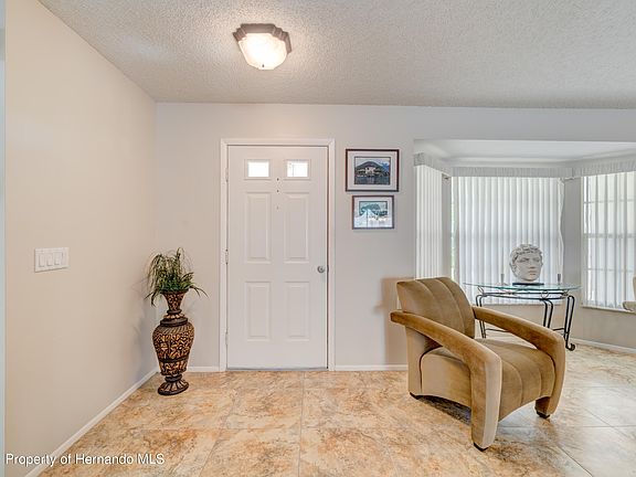 This 3bedroom 2 bath 2 car garage pool home in Timber Pines backs up to an open retention area and a view of the Grand Pines Golf Course. The home has living room, dining room, kitchen with dining area, family room, master suite and 2 guest rooms, one of which has built-in desk and bookcase storage. There is also a large walk-in pantry and inside laundry. The lanai is separated from pool area and deck by sliding vinyl doors. Pool and spa are both heated and there is a large seating area on the pool deck area and this pool area is completely screened-in. Most all of the furniture is included as well as the golf cart. The golf cart is in AS-IS condition and not warranted. The garage has sliding screen doors. This is a repaired sinkhole and all remediation documents are available. Home will have a NEW ROOF installed by end of May and other smaller repairs will be completed. This home is a Must See. Please call for viewing appointment.