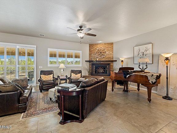 Discover exceptional mountain living in the highly desirable Williamson Valley area with stunning views of Granite Mountain as your daily backdrop. This thoughtfully designed four-bedroom, two-bathroom home spans 2,411 square feet and sits gracefully on a spacious two-acre parcel that offers endless possibilities for expansion and outdoor enjoyment. The heart of the home features an inviting open great room anchored by a charming corner brick fireplace, creating the perfect gathering space for family and friends. Elegant plantation shutters add both style and functionality while filtering natural light beautifully. The impressive kitchen serves as a culinary enthusiast's dream, boasting abundant cabinetry with soft-close drawers, gorgeous granite countertops, a convenient center island, a walk-in pantry, plus a generous elevated bar, a space encouraging conversation. The split floor plan design ensures privacy and comfort, with the spacious primary bedroom suite offering a tranquil retreat complete with a separate soaking tub and walk-in shower. Three additional well-proportioned guest bedrooms provide flexibility for family, visitors, or home office space. Step outside to the east-facing back patio, perfectly positioned to capture those delightful summer afternoon breezes while you relax and take in the surrounding natural beauty. The expansive two-acre lot provides ample space for future projects, whether you envision a future RV garage, guest house, barn or want room to breathe and enjoy the peaceful setting. Practical amenities include an oversized three-car garage and a detached storage shed , ensuring plenty of space for vehicles and storage. The location strikes an ideal balance between serene mountain living and convenient access to essential amenities. Within minutes, you can reach quality schools, shopping centers, numerous hiking trails, and the vibrant downtown Prescott area with its rich history and cultural offerings. This property represents a rare opportunity to own a slice of Arizona mountain paradise while maintaining easy access to modern conveniences. The combination of scenic beauty, thoughtful design, and exceptional location makes this home perfect for those seeking a lifestyle that embraces both tranquility and accessibility. Whether you are downsizing, expanding, or simply looking for that perfect mountain retreat, this property offers the space and potential to create your ideal living experience.