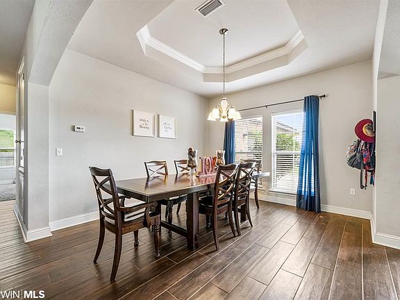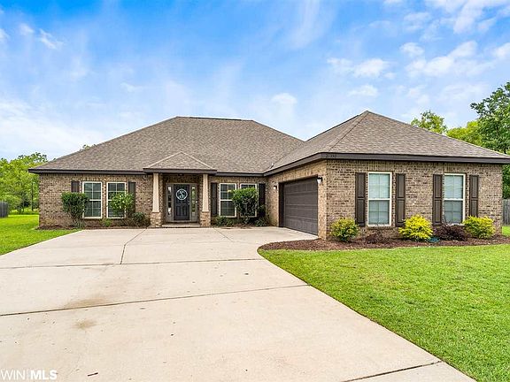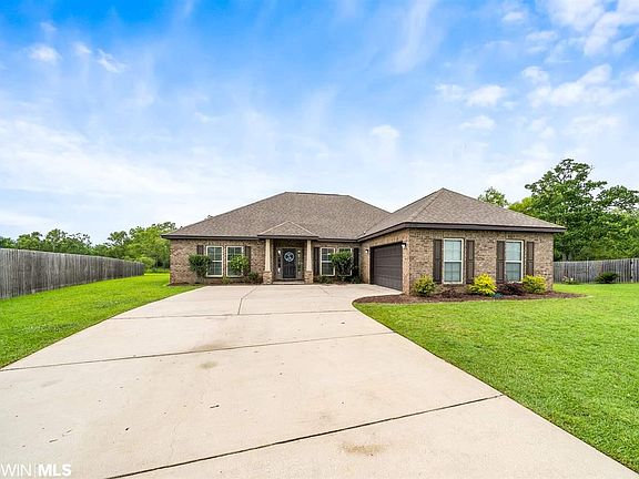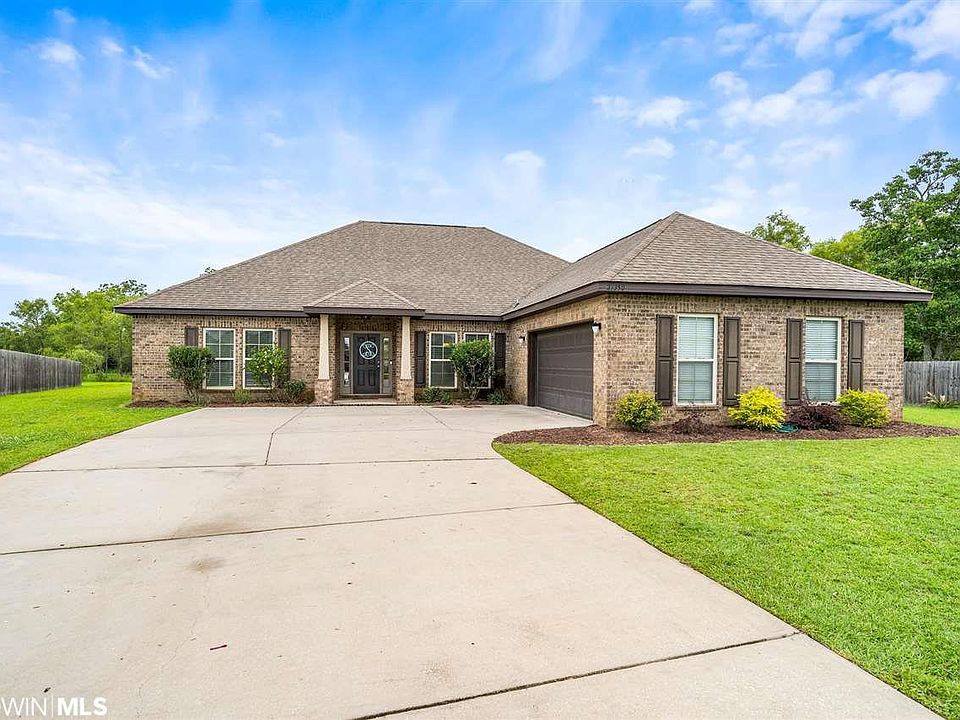 Lot of space in this home that is located on a culdesac lot with a private backyard overlooking the neighborhood pond. Just minutes from the beach express and part of the new Elberta High School feeder pattern. Beautiful and durable wood look tile flooring throughout the home and carpet in the bedrooms. The home boasts 4 bedrooms and an office/bonus room. The kitchen has a breakfast area, dark cabinetry, and black appliances. The breakfast area leads to a covered porch and a level and private backyard that backs up to a pond (no rear neighbors!) As you enter the home there is a separate office/bonus room (could easily be used as a 5th bedroom if needed.) to the left and the dining room to the right. There is a 1/2 guest bathroom in the hallway. The living room is straight ahead with a ceiling fan and lots of light coming in from the windows. The kitchen has a breakfast area, granite counter-tops, dark cabinetry, and black appliances. The breakfast area leads to a covered porch and a level and private backyard that backs up to a pond (no rear neighbors!) To the left side of the main living areas is a large master bedroom and en-suite bathroom with soaking tub, separate shower, and dual granite counter-top vanities. To the right side of the main living area are the 3 bedrooms, full bathroom, and laundry room. The welcoming subdivision is located close to the beach express so easy access to beaches, Foley, Pensacola, and an easy drive to I10. The neighborhood feels secluded but is only minutes from the growing Foley area with shopping and restaurants. Part of the brand popular and newly created Elberta High School feeder pattern.