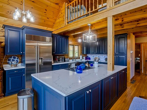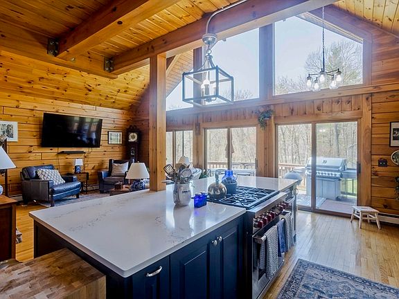 Welcome to this beautifully updated 3 bed, 2 bath Lincoln Log home which blends rustic charm with thoughtful upgrades. Inside, you'll find vaulted, beamed ceilings, gleaming hardwood floors, c-air, & a striking floor-to-ceiling stone fireplace highlighting the living room. The upgraded kitchen offers both style & functionality, & is a chef’s delight, featuring a premium Wolf propane stove for precision cooking & a touch of culinary pizzaz. A cozy loft provides extra space for relaxing or working from home while the luxurious primary wet bath adds a spa-like touch. Large primary bedroom w/ walk in closet is a pleasant private retreat. Off the kitchen enjoy the deck, perfect for entertaining. The 1.6-acre corner lot is framed by classic stone walls & offers plenty of space and natural beauty offers a timeless New England charm. A 24x28 heated & cooled outbuilding with electric is ideal for a workshop,studio,or home-based business. Convenient location while offering serene country living.