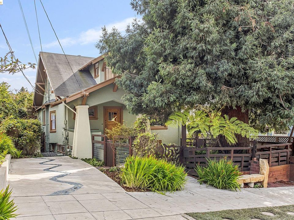 Many local craftsmen and artists have contributed to the unique character of this North Berkeley home. Enter through the custom metal gates to the foyer that welcomes you with elegance, while the original pocket doors reveal a living room and dining room adorned with faux wood and stone finishes. The custom built kitchen by Berkeley Mills features mahogany cabinets and Viking stove (and some much needed pantry space!). Both kitchen and dining room open seamlessly to the deck and create a wonderful indoor outdoor flow. On the main level, also find a well appointed bedroom and a tiled bathroom. Up the stairs, light pours in from every direction. Here, the two bedrooms and one spacious bathroom with skylights await you. Sit by the window of the primary bedroom and enjoy watching the sun set over the Golden Gate, and notice the gorgeous closet doors that recreate that very sunset. Downstairs, connected to the house but also with a separate access, the in-law unit features a bedroom, full bathroom and an open dining and living room overlooking the yard. The oasis of greenery and privacy invites you to start your day with coffee in a private hot tub, surrounded by lush gardens. Indulge in the vibrant neighborhood, with gourmet shopping district, parks, and a rich cultural scene.