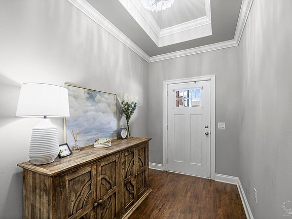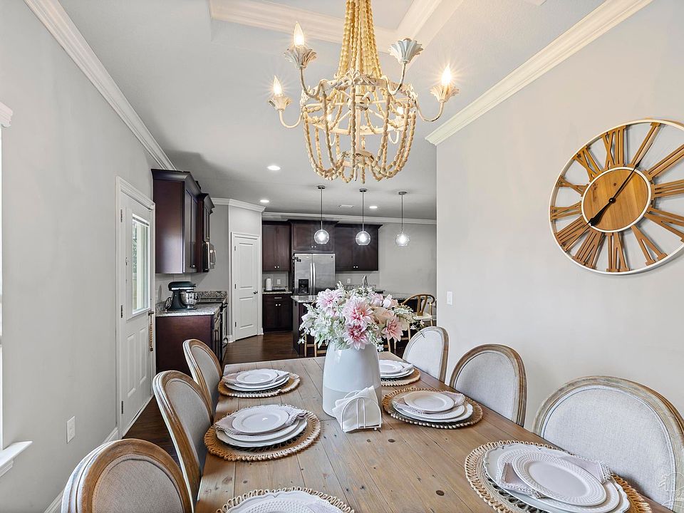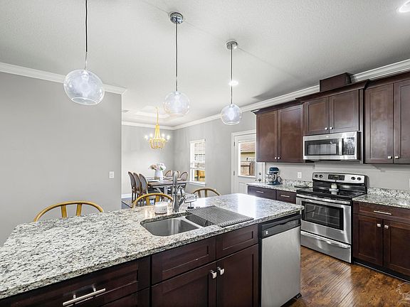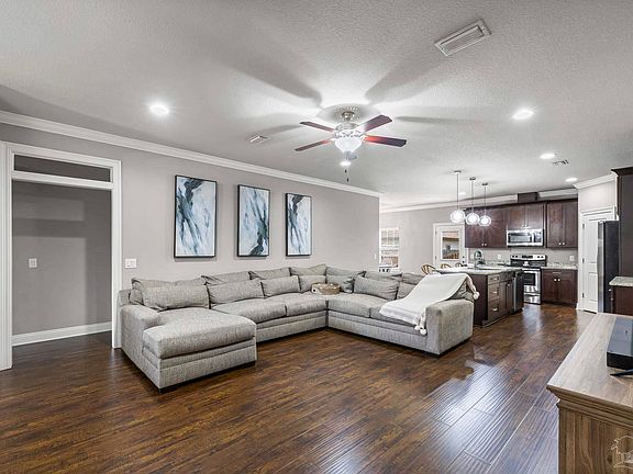 Move-in ready 3 bedroom, 2 bathroom single-family home with 1623 sq ft of living space. Built in 2015, this property offers No HOA and sits on a quiet street in Navarre. Inside you'll find an open floor plan with wood laminate flooring in the main living areas, neutral tile in the wet zones, and carpet in the bedrooms. The primary suite features a tray ceiling, custom walk-in closet with built-ins, and a private bath. Crown molding, wide baseboards, transom windows, and upgraded doors and hardware add detail throughout. The kitchen features granite countertops, stainless steel appliances, breakfast bar seating along with a separate dining room, plenty of cabinet space and a pantry. The exterior is clad in durable Hardie board with an architectural shingle roof. Outdoor features include a covered front porch, fenced backyard, sprinkler system, and two-car garage. Located in East Navarre close to Hurlburt Field, Eglin AFB, shopping, schools, dining, and the white sand beaches of Navarre.