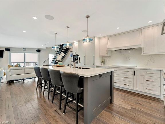 Welcome to the ultimate lakefront lifestyle. This fully renovated 3-level townhouse hass unobstructed, panoramic views of Lake Ontario so close to the water, you can practically dip your toes in. Located just 600 metres from downtown Burlington, this is a rare blend of tranquility and convenience. This 3-level townhouse (1,600 plus SF) has 1 bedrooms (potential for 2nd if you converted large walk-in closet back into a bedroom), 3 bathrooms (2 full, 1 powder) and 4 separate patio/terraces (huge 400 SF lower terrace at the water's edge). In 2020 this unit was completely gutted to the studs and rebuilt by the renowned Bespoke Home Solutions with a total renovation budget exceeding $500K . The gourmet kitchen has been masterfully crafted with designer finishes including: Insinkerator food waste disposal, hot water tank/dispenser, Porter & Charles warming drawer, Built in Miele Appliances (including a $7K plumbed in Coffee Machine), microwave/convection oven, Combi Steam Oven, Dacor Fridge & Freezer and Gravelle custom cabinetry throughout. The spacious primary suite is a true retreat, featuring a spa-inspired ensuite with heated floors, a two-person soaker tub, and a private balcony with stunning sunrise views over the lake. The second bedroom has been converted into a designer walk-in closet with custom cabinetry and a centre island (easily reverted to a bedroom if desired). Lower level family room has a full bathroom, ample storage and ability to have a guest suite with use of a murphy bed. Backwater valve in basement. Home is equipped with Sonos built in ceiling speakers with hooked up amplifiers and speaker selector options. Large 400 SF back terrace is fashioned with a BBQ gas line and has a hook up for a Hot Tub.