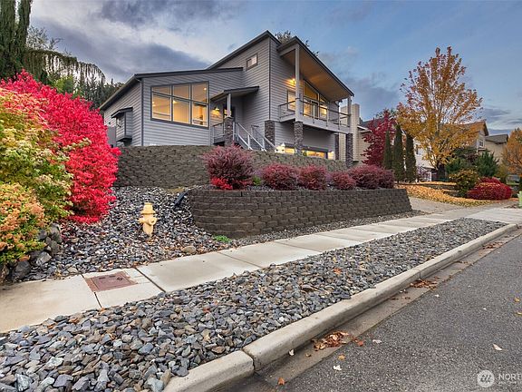 Modern custom home with panoramic Columbia River views & quality finishes throughout. Solid wood doors, upgraded trim, wood-wrapped windows, LVP & walls of glass capturing sweeping views. The open living area features a beautiful propane fireplace & the kitchen includes an RO water tap & is stubbed for a gas range behind the current electric range. Huge island with extra storage & seating plus beautiful quartz countertops. Upstairs, the primary suite offers automatic blinds, spa-like 5-piece bath with heated floors, soaking tub & dual head tiled shower PLUS a walk-in closet with ladder to a secret office. Lower level includes a family room,4th bedroom, & ¾ bath. The irrigated backyard provides views & a paver patio perfect for entertaining.