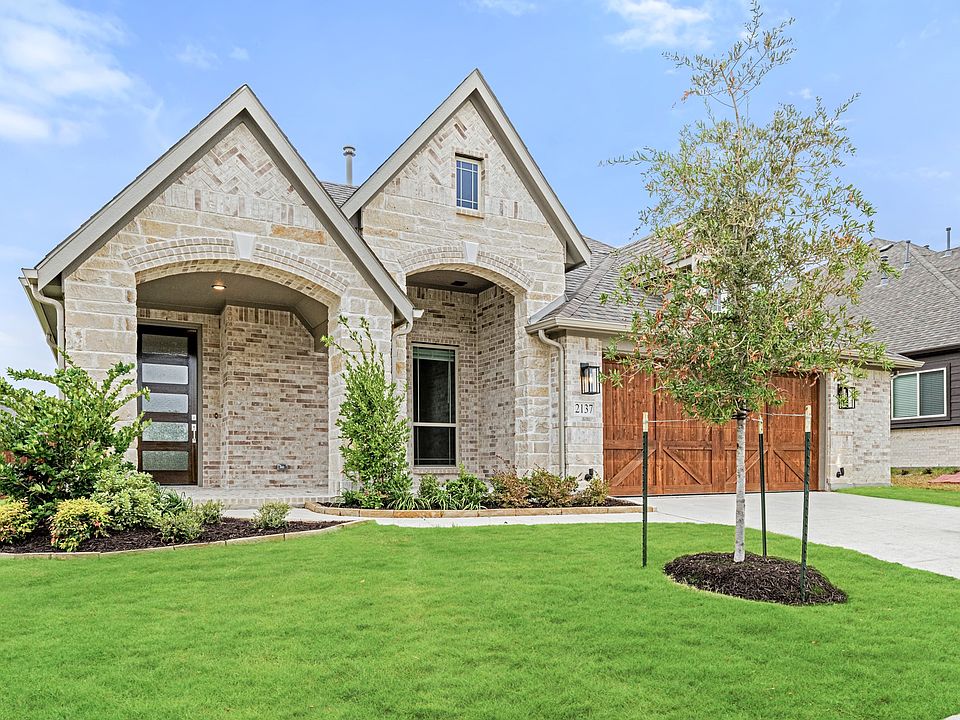 NEW! NEVER LIVED IN. Captivating two-story retreat boasting 4 bedrooms, 3 baths, and an inviting open-concept living area that basks in natural light. This plan showcases an appealing brick and stone exterior complemented by an oversized Covered Front Porch and a 2-car garage, backing up to open space with views of a pond! Inside are 3 bedrooms on the first floor, including a roomy Primary Suite; the 4th bedroom with a full bath right outside is located upstairs. Study or Dining option off the entrance. Game Room flex space upstairs to entertain or unwind. Wood-look tile floors adorn downstairs common areas, giving you easy-to-clean and trendy! The heart of the home lies in the Kitchen, where gas cooking on built-in SS appliances and storage await you. Tall ceilings accentuate the breakfast area that opens to the Family Room showcasing a modern tile fireplace. Window seats, window coverings, mudroom, and so much more! This is worth a tour, come visit Bloomfield at Devonshire today.