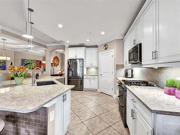 Desirable WCI home. Impact Resistant Doors, lake views with fountain. This superb carriage home has a 2 garage, storage racks & fridge. Turnkey ! No Carpet. Tile & Wood. Upgradedfurniture. Leather sofa. Customized build-in cabinets in Owner suite, King size bed . Luminous open floorplan, windows blinds. Gourmet kitchen, GE Cafe Appliances, gas & double oven, quartz counter tops, walk-in pantry, refined custom built-in closet storages, crown molding, all 42" off-white kitchen cabinets with pull out drawers. The oversized tiled screened-in lanai is accessible from the Owner Suite, Living– and Dining room. LaMorada offers a highly social active 13,700 sqft clubhouse inspired by the British West Indies, yoga room, movie center, culinary kitchen, restaurant, pool bar, lap pool , hot spa, lakes and 15 acres preserves, tennis, pickleball. Dog park. The variety of High End Homes up to $2.0 Mill is superb. All located close to Int. airport, with the desirable North Naples A rated school district. An elevated Naples location! Close to all Beaches, next to ”The Point of Founders Square“ and convenient to access Vanderbilt Road to enjoy Downtown Olde Naples.
