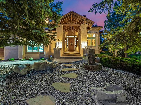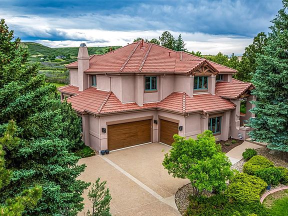 Seize the rare opportunity to own a true designer masterpiece crafted by Summit Chalet Custom Homes. This illustrious property, formerly owned by the proprietor of Plum Creek Golf Course, sits enviably on the 12th hole, offering a serene and private setting surrounded by lush trees w/ breathtaking views directly backing to the golf course & wide open space. Indulge in the resort-like ambiance and savor the tranquility and exclusivity that this premium lot affords. Step into a stunning entryway that sets a tone of luxury & sophistication. Main level includes an executive office, formal living room w/ fireplace & a formal dining room. The gourmet kitchen opens to a dining nook and large family room w/ tons of windows & natural light. Distinctive architecture features include curved walls, angular designs & rich wood accents, complemented by custom paint. Spanning a generous floor plan, the home boasts 4 spacious bedrooms upstairs, each complete w/ an en-suite bath. The primary suite features a built-in showcase, double-sided fireplace, cozy sitting room overlooking the open space & a luxurious 5-piece en-suite bath. The home is meticulously updated w/ refinished hardwood floors and high-end finishes, including high end electric window blinds, a JennAir double oven & 4 fireplaces that add a warm ambiance to the space. Recent updates ensure comfort & convenience w/ a newer HVAC zoned system and newer exterior paint & new toilets. The covered patio seamlessly adjoins the indoor & outdoor spaces, perfect for dining al fresco, enhanced by a newly installed water feature for an element of tranquility & beauty. The fully finished walkout basement is a haven for entertainment & relaxation, featuring a living room w/ a fireplace, rec room, complete theater room w/ acoustic walls for an unrivaled audio experience, a 5th bedroom, and 3/4 bath. Experience luxury living at its finest in this unparalleled home, where every detail is carefully crafted for supreme comfort and style.