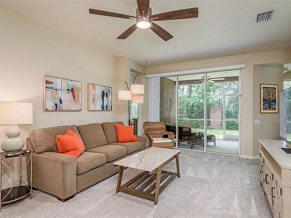 Great Opportunity for a Ground Floor unit with Garage and a wonderful private View! Enjoy living in a Gated community close to restaurants, shopping, entertainment and more! Your front covered entry leads into an inviting Foyer. The Living area is spacious and flows into the Dining area. The Kitchen has a Closet Pantry and an abudance of cabinet space. Enjoy the Breakfast bar that overlooks the Living Area. There is also a Breakfast Nook/Coffee Bar area too!! The Primary Bedroom has wonderful natural light and a large Walk In Closet! The En Suite Bathroom features Dual Sinks and a large vanity area. The Glass Enclosed Tiled Step In Shower is very roomy! The split bedroom plan has the 2nd bedroom adjacent to the main Bathroom. The 3rd Bedroom can easily be utilized as a Home Office/Den. The Laundry area is conveniently located near the Guest bedroom and out of the main access area. Access to the Lanai is available from several locations in the home. The Lanai overlooks the greenspace in the rear of the property and the treed private view. You will enjoy the Community Pool and Clubhouse with Fitness Center and the abundance of Guest Parking. The Monthly fees include building insurance, water, sewer, trash, grounds maintenance, exterior pest control and community amenities. Pets Allowed!! See this well priced Unit Today!!