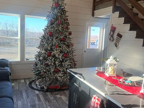 The 2,400 sq ft (24x100) horse barn features 7 rubber-matted stalls, complete with water and electric, and is supported by two fenced paddocks with two run-in sheds, creating an ideal setup for your horses. The impressive 60x100 insulated shop boasts concrete floors, water, electric, and full 110/220 hookups, along with two 16' wide x 14' tall bay doors and four 12' wide x 14' tall bay doors, making it perfect for equipment, business use, or storage. Attached living quarters offer 920 sq ft of thoughtfully designed space, including 600 sq ft on the main level and a 320 sq ft loft. This 2-bedroom, 1-bath living area showcases quartz countertops, custom cabinetry with soft-close features, mini-split systems, and a custom tile shower, all finished with quality craftsmanship. LED lighting illuminates the exterior of the entire property, enhancing both beauty and security.