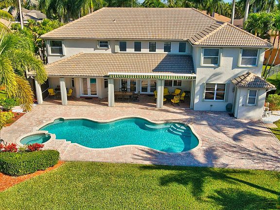 Exquisite 7-Bedroom Estate in Boca Falls.Welcome to this stunning 7-bedroom plus office estate home, ideally situated on the largest lot in the prestigious Estates of Boca Falls. Nestled on a rare pie-shaped cul-de-sac property, this residence offers sweeping lake views, unmatched privacy, and true resort-style living.Step inside to a thoughtfully designed layout with a FIRST-FLOOR primary suite featuring French doors that open directly to your private outdoor retreat. Enjoy a heated oversized pool with elevated spa and cascading water feature, cabana bath with outdoor shower, and lushly landscaped fenced yard--all controlled with a wireless Aqualink system. The primary suite also includes custom built-ins, double walk-in closets, and a luxurious spa bathroom with Jacuzzi tub, and a separate shower with dual rain heads.