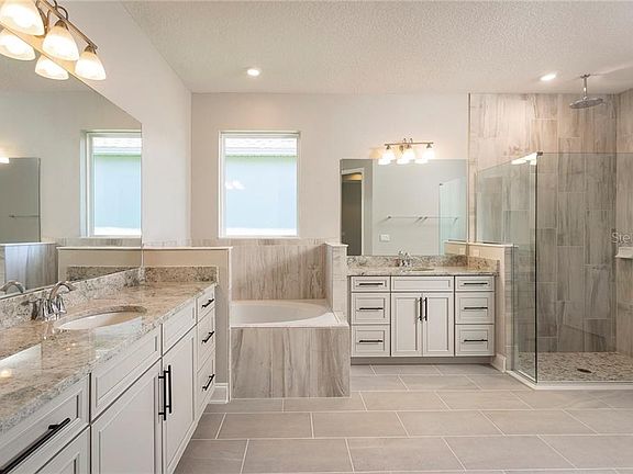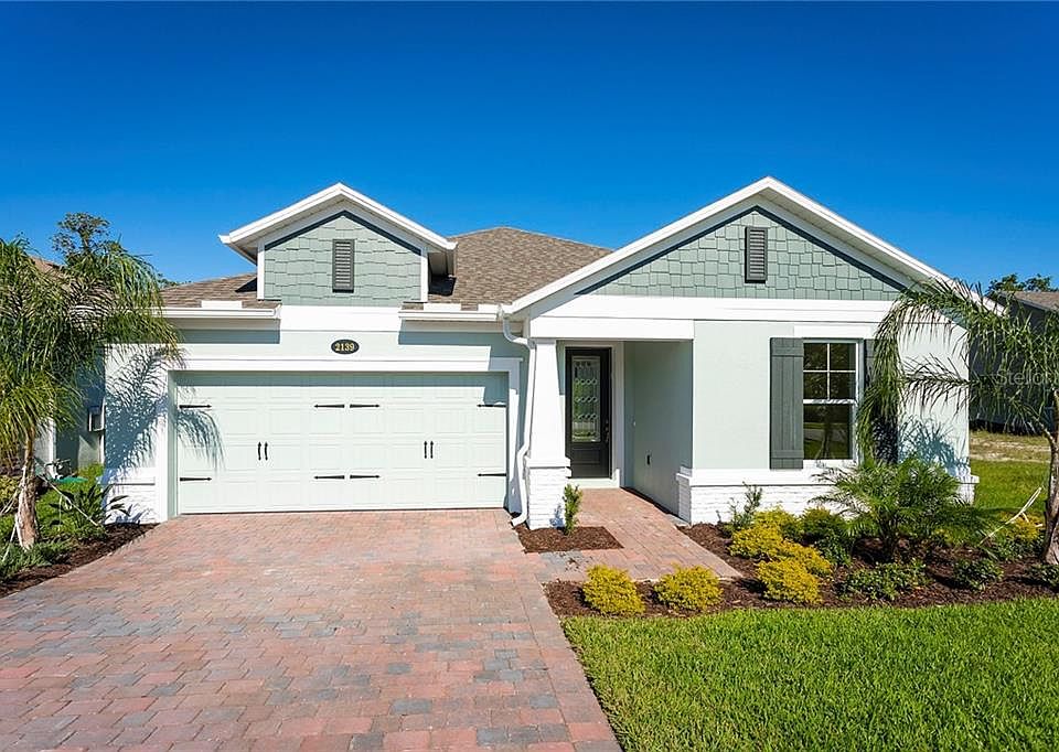 This new home is a single-story, 3-way split plan with 4 bedrooms and 3 baths. Off the foyer, find a bedroom with its own full bath at the front of the home. The owner's suite, and two additional secondary bedrooms that share a hall bath, are separated by the living areas for added privacy. Wood-look tile flows gracefully throughout the main areas, leaving upgraded carpet in just the bedrooms. You'll have a place for everything in the kitchen with its walk-in pantry and ample banks of painted maple cabinets. The chef of the family will love with the GE® stainless steel appliance package that includes an Advantium wall oven, a convection wall oven, and an exhaust hood hung over the natural gas cooktop. The maintenance-free quartz countertops, farmhouse sink, and stylish backsplash are the icing on the cake. The dining room and great room are separated by an arch detail and a triple 8' sliding glass door which opens up to the covered lanai. The owner's suite has 3 rear-facing windows, allowing view to the backyard. With double walk-in closets, separate vanities with granite countertops, and a large shower with upgraded wall tile to the ceiling, a fun river rock shower floor, and a semi-frameless enclosure, it's plenty big for everyone during the morning routine. This home is built with features that meet the Energy Star® 3.1 home building requirements and is backed by M/I Homes' 15-Year Transferable Structural Warranty. For more information on this home, contact us today