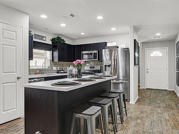 Beautiful and well-maintained 4-bedroom Pulte home offering a smart, versatile layout and modern finishes throughout. The open-concept living space features soaring ceilings, recessed lighting, and a cozy gas fireplace. The kitchen showcases quartz countertops, stainless steel appliances, and a glass mosaic subway tile backsplash, all centered around a spacious island. The primary suite is located downstairs with dual vanities, a soaking tub, and separate shower. Upstairs offers a game room and three generously sized bedrooms. A formal dining room at the front of the home provides flexible use as an office or creative space. Step outside to your private enclosed screened-in patio which is perfect for relaxing and enjoying the outdoors. Roof replaced in 2019. Conveniently located near Beltway 8 and I-10. Schedule a tour today!