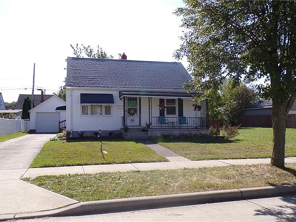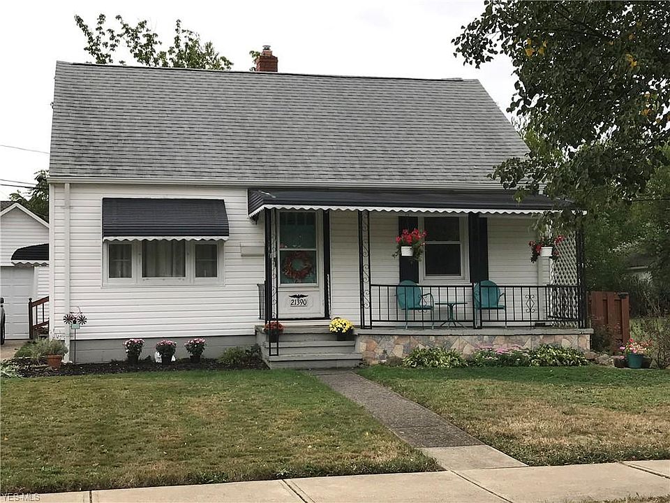 This beautiful cape cod/bungalow is well appointed with updated roof, siding, gutters, tilt in windows, furnace/AC, breaker panel, kitchen with glass tile back splash, under cabinet lighting, dishwasher and garbage disposal. The home has been freshly painted with hardwood flooring throughout. The bedrooms are spacious with an extra large upper level bedroom with tons of storage space. Enjoy the 8ft X 14ft patio enclosure with porcelain tile flooring & sliding glass windows, overlooking privacy fenced-in backyard. The basement is equipped with newer glass block windows, double door storage cabinets and plenty of space. There is a large 18ft covered front porch with awning & adjustable bamboo curtains for privacy. The decorative updated white lattice fencing borders the driveway. The garage has updated door/opener & electrical. Just move in and enjoy all the conveniences this home has to offer. Close to Rt. 2 & E. 200th Street & centrally located near Euclid schools.