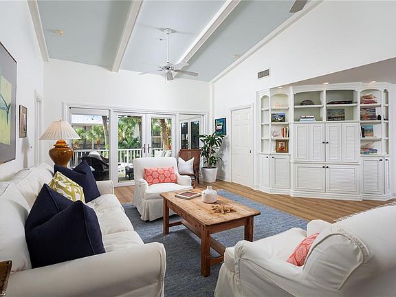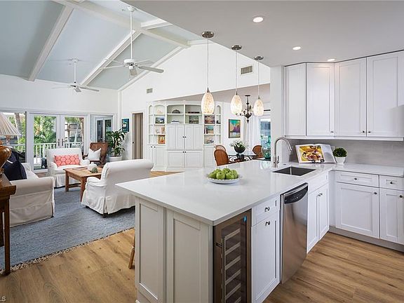 Experience the best of coastal living just near the beach and the charm of 5th Avenue South. Coconut Grove has been beautifully reimagined with a complete exterior renovation, featuring coastal-cottage accents like board and batten, sleek gooseneck lighting, a modernized pool area, and newly installed hurricane windows and doors. Lush landscaping and ambient lighting add to the property’s nighttime appeal. Inside, the updates continue with an open-concept kitchen boasting bright white cabinetry, quartz countertops and stainless steel appliances. Vaulted ceilings with detailed beams add a spacious feel to the main living area, while the primary and guest suites offer tucked away privacy. Enjoy seamless indoor-outdoor living with a large screened lanai opening to southern exposure for year-round sunshine and the ultimate Florida lifestyle.