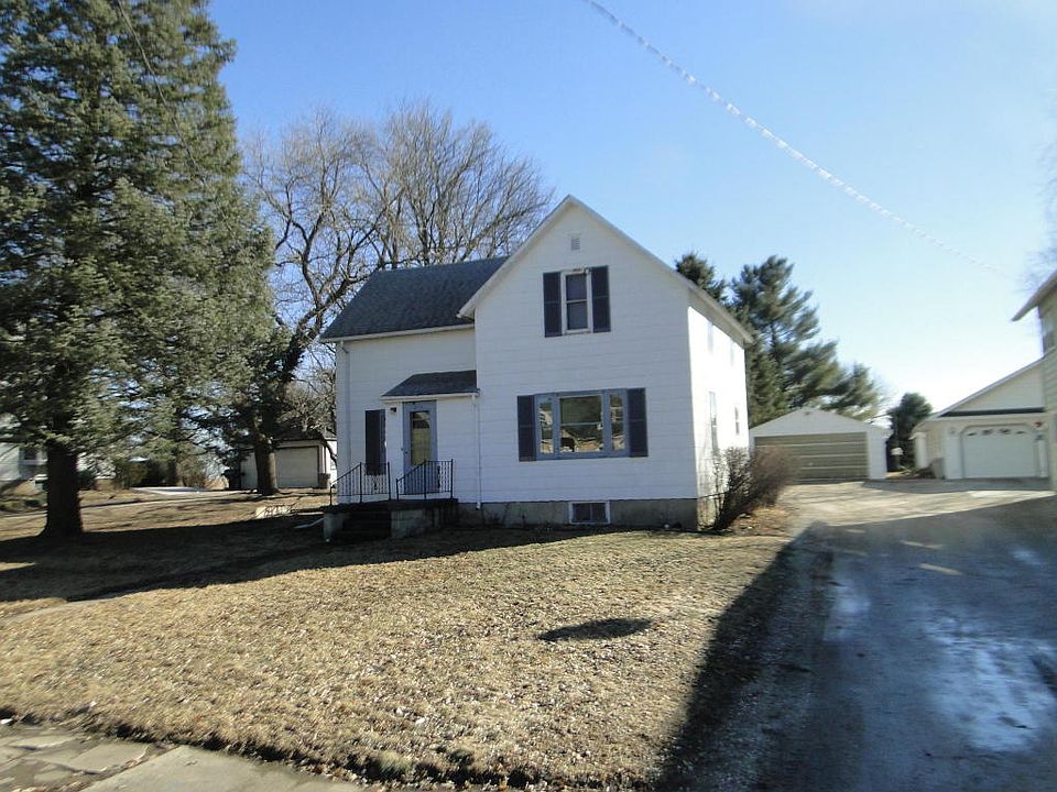 Lots of potential here! New roof and some nice hardwood floors. located on the edge of town on a half-acre lot.Hardwood floors! Great location, close to school, downtown. Great view of Hubbard prairie out back. The pocket door to kitchen, built in linen closet upstairs, cute pantry in kitchen, built in drawers in dining room, and built in shelves in living room. The open stairway and bonus closet next to stairs. High efficiency furnace. This is a cute, cozy starter home or for a small family.
