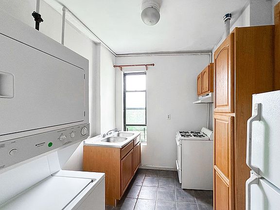 The apartment has had recent updates such as redone floors and completely repainted throughout the apartment. There’s a large separate kitchen that includes a washer/dryer. There’s also tons of closet space throughout the apartment. Both Bedrooms have tons of light and can easily fit Queen sized beds and much more. One bedroom has beautiful french doors. The bathroom can use a little updating but has charming features like a clawfoot tub.
