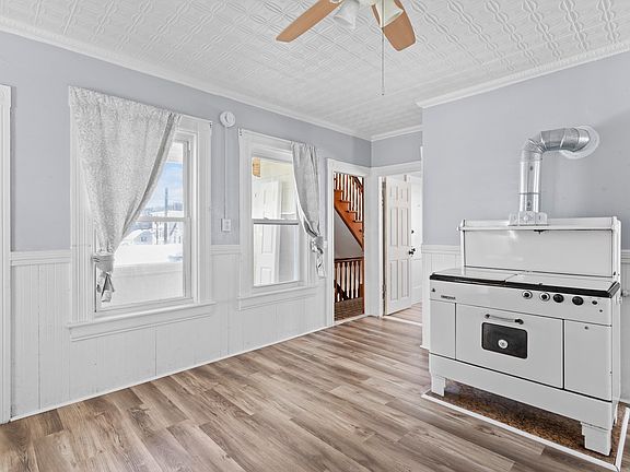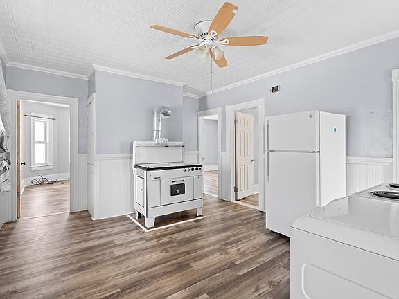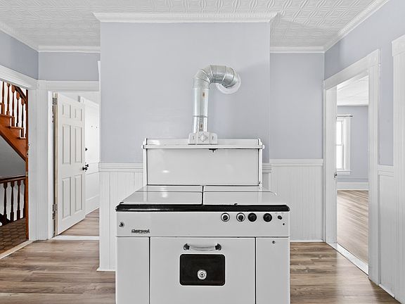 Classic Details like high ceilings, decorative trim, and a vintage-style stove for added character