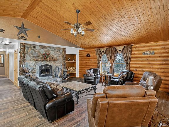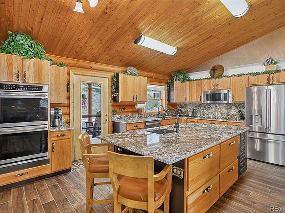 Enjoy breathtaking year-round views in this stunning, turnkey, custom log raised ranch home on 3.65 acres, featuring 3 bedrooms—two of which are primary bedrooms, each with an ensuite bathroom—4 bathrooms, an office, an oversized 2-car attached garage, a separate 1-car garage, plus a spacious detached garage with an oversized door. The driveway is a spacious mountain driveway with two separate entrances with ample room for maneuvering, turning around, and lots of parking. Large Pella windows throughout create a bright, inviting atmosphere, showcasing gorgeous views and natural light. The main floor features an entryway, a spacious living room with vaulted ceilings and a wood-burning fireplace, plus a large dining room with custom handrails. The gourmet kitchen includes a double oven, huge island, granite countertops, newer stainless appliances, two sinks, and ample storage. One primary bedroom, located on one side of the house, features dual walk-in closets and a newly remodeled shower. The other primary bedroom, down the hall, has a completely remodeled ensuite bathroom, alongside an additional bedroom, full bathroom, laundry, and a dedicated office. The walk-out basement includes a family room with a pellet stove, double sliding doors to the lower patio, plus space for a playroom, workout area, or office. It also offers another bathroom, large storage room, an oversized 2-car attached garage with epoxy floors, drywalled and painted, and a separate 1-car attached garage. Relax on the large vaulted covered patio or enjoy the detached garage for hobbies or toys. Utilize the RV pad with water, sewer, and 220V electric hookups. This meticulously maintained Wildfire Partner Certified mountain home, with high-speed internet available, is in Coal Creek Canyon in Boulder County near Crescent Meadows, Walker Ranch trailheads, Gross Dam Reservoir, and in close proximity to Arvada, Boulder, and Golden. A 1-year 2-10 Buyer’s home warranty is included.