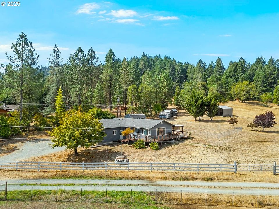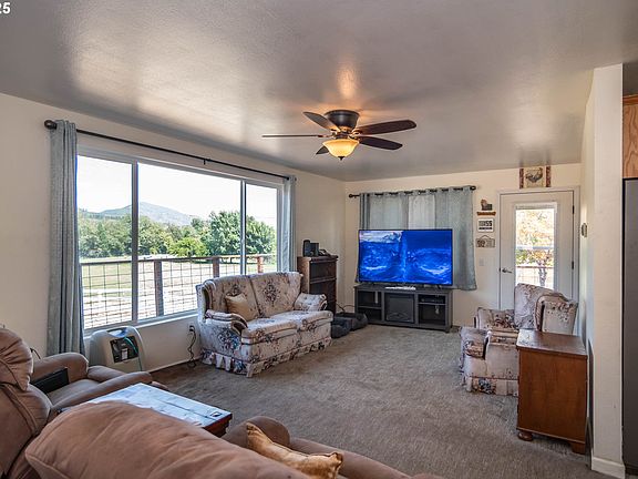 Beautifully updated home on 1.5 flat, fully usable acres, offering privacy and stunning mountain and valley views in every direction! Oversized windows bring the outdoors in, showcasing the scenery year-round.This home features numerous updates: new kitchen cabinets and counters, new siding, fresh interior and exterior paint, a newly built garage with heater, and new appliances. Roof was replaced in 2022. Flooring was updated in 2022 with laminate and later covered with 2024 carpet (except in two bedrooms), which can be removed if preferred. The home’s water is supplied by Cow Creek, with two additional wells on the property for irrigation. Water rights and direct river access.The property offers exceptional amenities: a two-bay RV steel structure with 50-amp power, a large shed/shop with 50-amp power, two additional sheds, a chicken coop, and fruit trees. The entire property is fenced, with a separate dog run large fenced pasture area. The garage includes an electric car charger, generator, and heater—all included in the sale.Come and enjoy peaceful pastoral living with breathtaking mountain views—and take in both sunrise and sunset right from your own home!