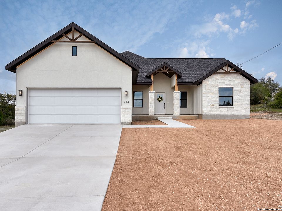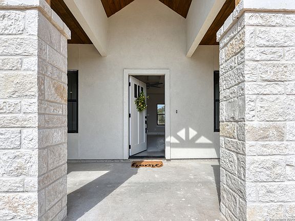 Great split floor plan! This beautifully designed one-story home sits on just over a quarter-acre lot in Rockin' J Ranch. Sleek lines with a twist that has a farmhouse look & feel ... every space complimenting the other. Open and flowing beautifully from kitchen to dining to living room. The attractive kitchen features stunning quartz countertops and a contrasting tiled black backsplash, 42" cabinets with under-cab lighting, and stainless steel appliances. The Master Suite entices one with a spacious 9x9 walk-in closet and en suite bath with double vanities, an oversized walk-in shower, and an inviting soaking tub. The expansive covered patio will bring everyone outdoors to enjoy endless days of relaxation or whatever is their pleasure or passion! Additional features include Low E windows, radiant barrier, 9' ceilings in all rooms, tiled flooring throughout, quartz bathroom vanities, recessed lighting, programmable thermostat, plumbed for water softener, sod 20' front/back from the slab, designer paint and many other touches for a custom look and feel. Neighborhood amenities include a pool, park, biking trail, golfing at the very well-known Vaalar Creek Golf Club, and more! Located just a few miles south of the historic town of Blanco and a 40-mile radius of Austin, San Antonio, Marble Falls, Boerne, and Fredericksburg. Come and enjoy the RJR lifestyle!